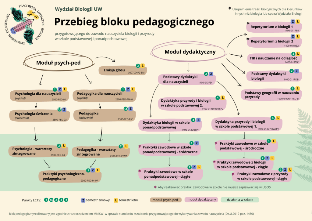 Przebieg bloku pedagogicznego na Wydziale Biologii UW, przygotowującego do zawodu nauczyciela biologii i przyrody, realizowany jest zgodnie z rozporządzeniem MNiSW w sprawie standardu kształcenia przygotowującego do wykonywania zawodu nauczyciela (Dz.U.2019 poz. 1450).